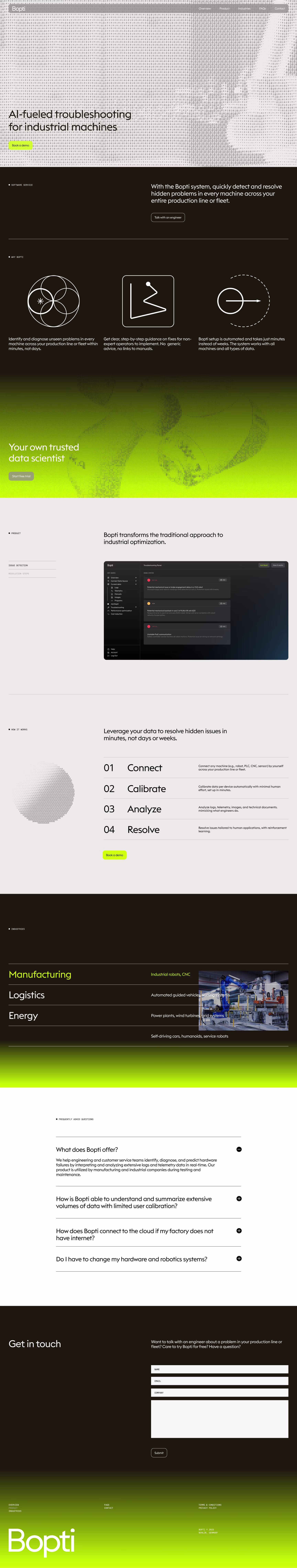 Bopti has developed an AI-powered software solution that quickly detects and resolves hidden problems in every machine across an entire production line or fleet — within minutes, not days. Through its platform, Bopti is transforming the traditional approach to industrial optimization. Bopti wanted an audacious yet also professional and flexible visual identity system to help it stand out. Ayla designed the visual identity and website, wrote much of the copy, developed the website, and above all created a solid foundation on which to evolve the Bopti brand.